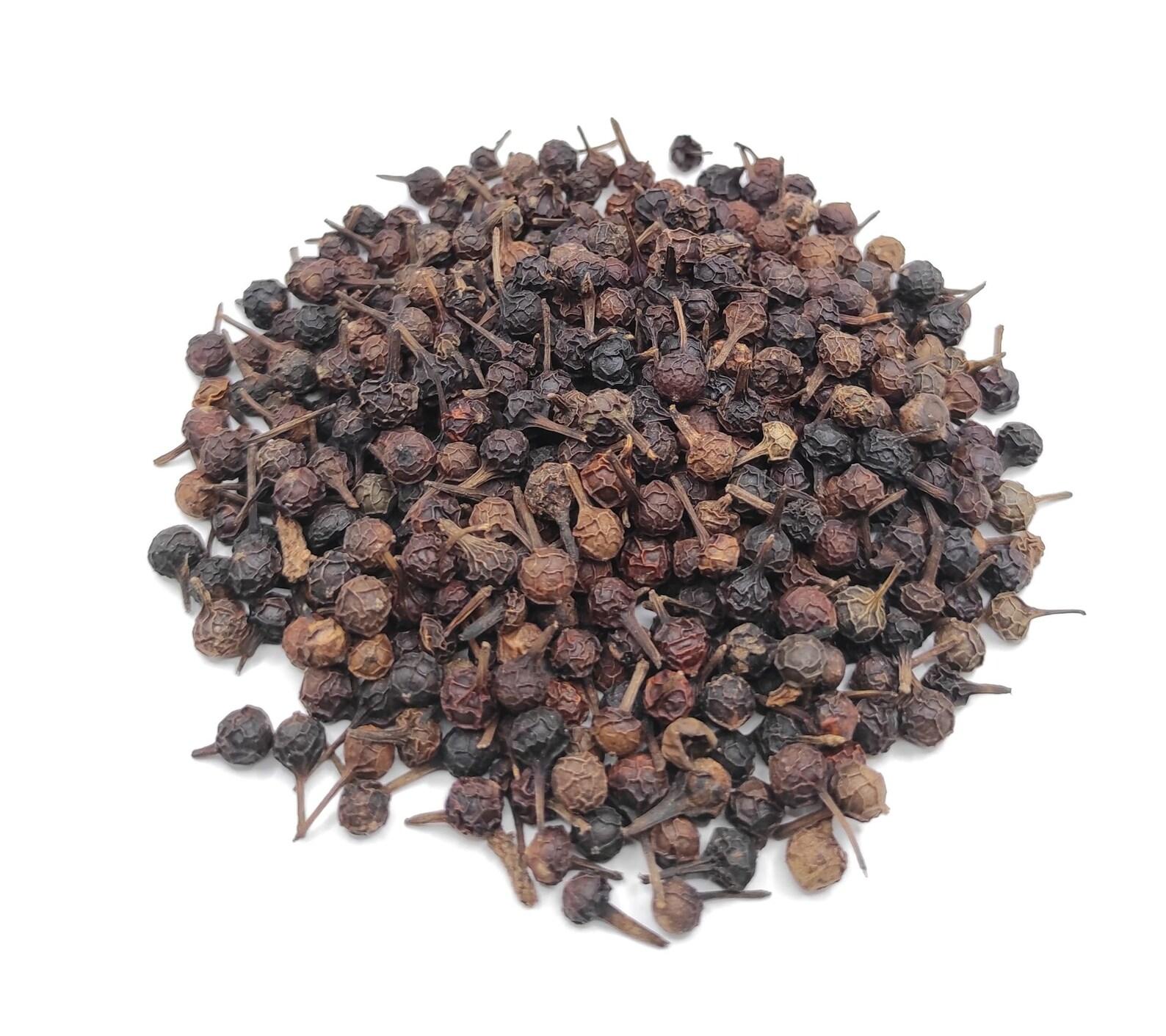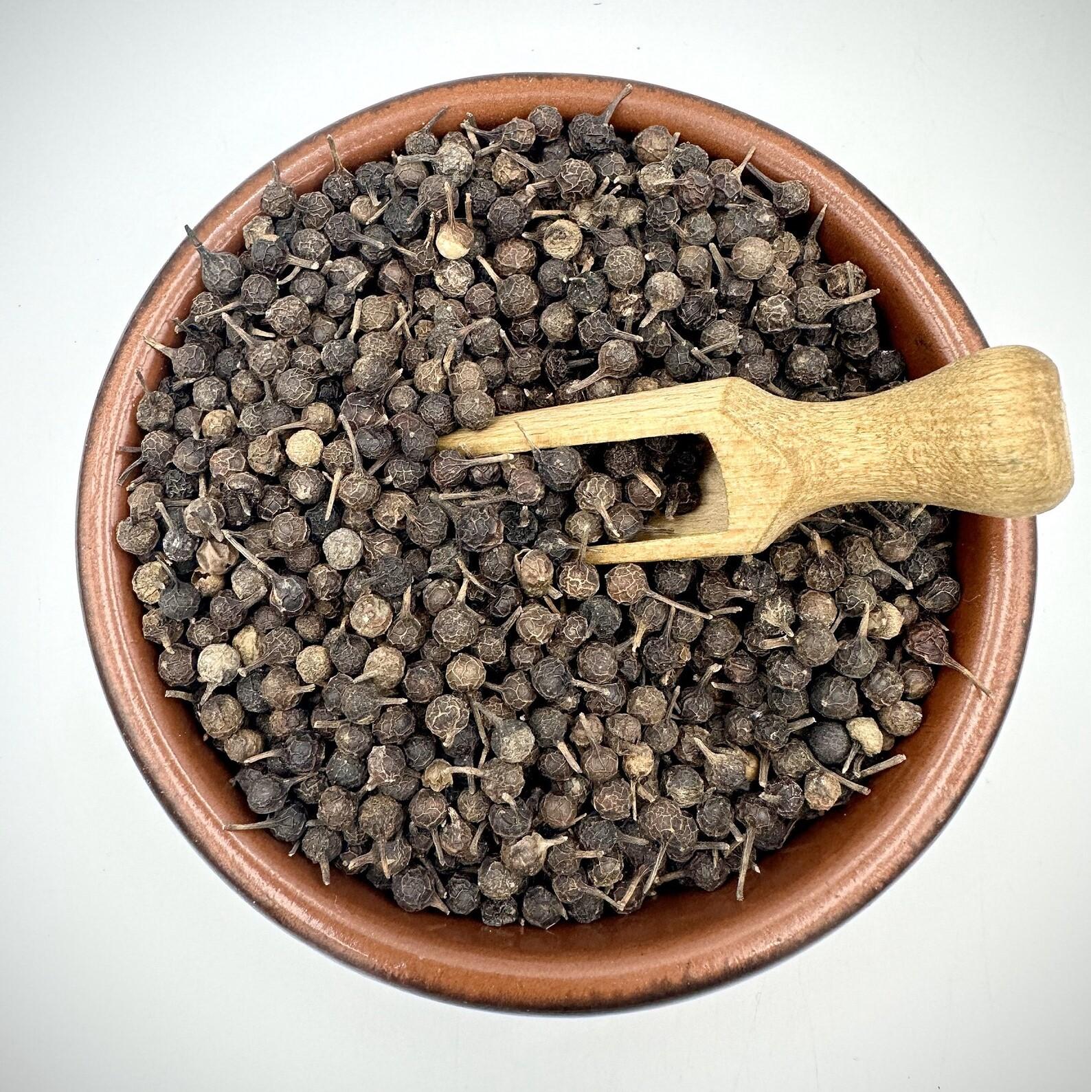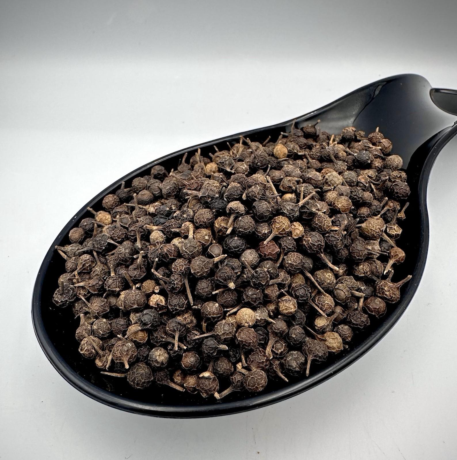Cubeb berries, also known as Java pepper or tailed pepper, are small dried berries that come from a plant called Piper cubeba, which is native to Java and other parts of Indonesia. The plant is a member of the pepper family and the berries have a pungent, slightly bitter flavor with hints of juniper and citrus.